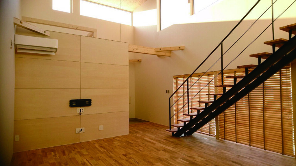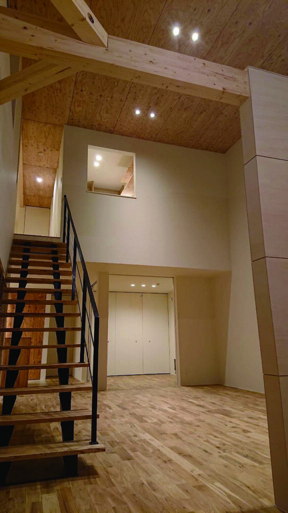 天井までのびる木の梁とOSB材の天井が印象的。心地よい開放感に包まれる空間。