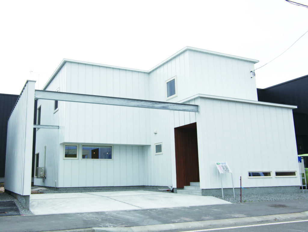 白と木のアクセントが映える、スタイリッシュなファサード。