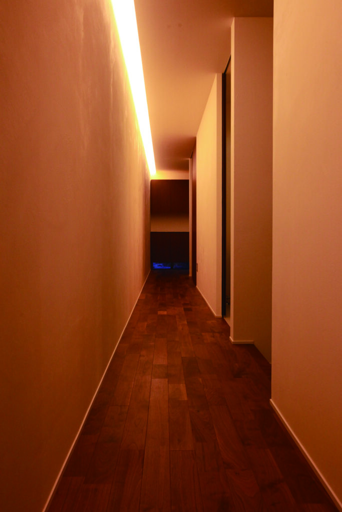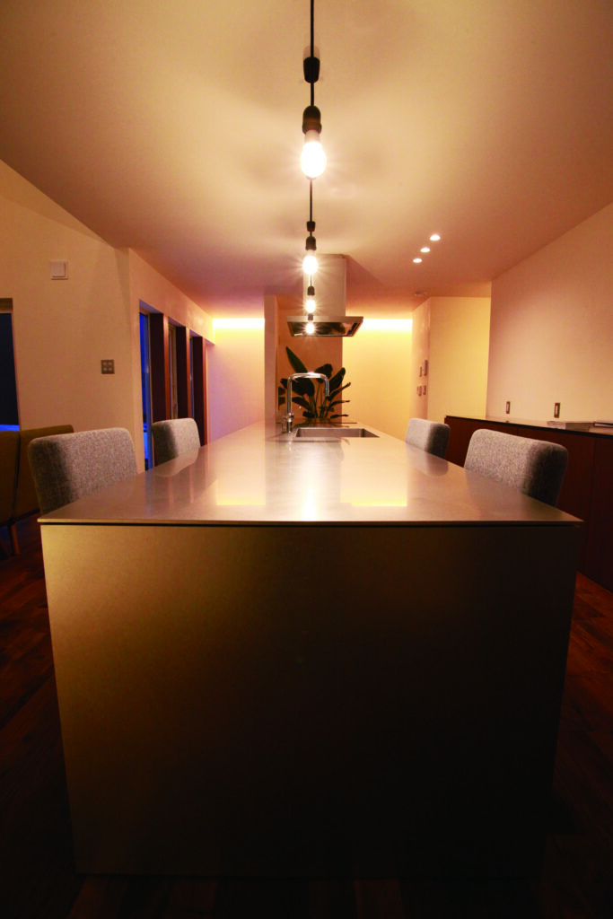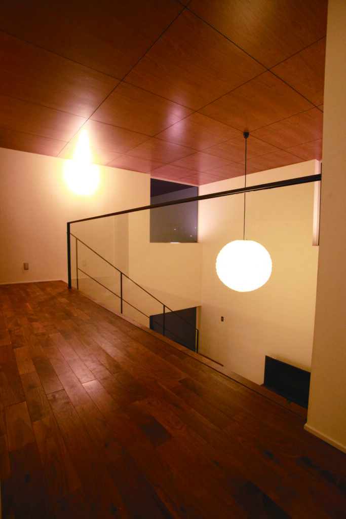 上部から見下ろすリビング。格子と照明が空間のアクセントに。