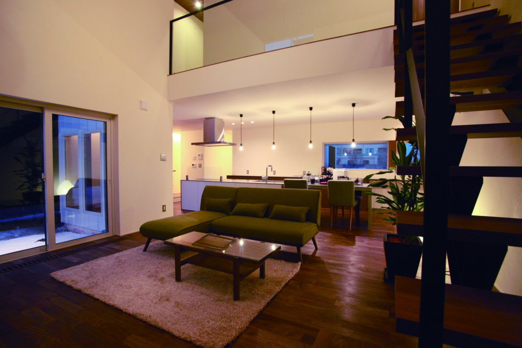 吹き抜けの開放感と落ち着いた色合いの家具が調和。