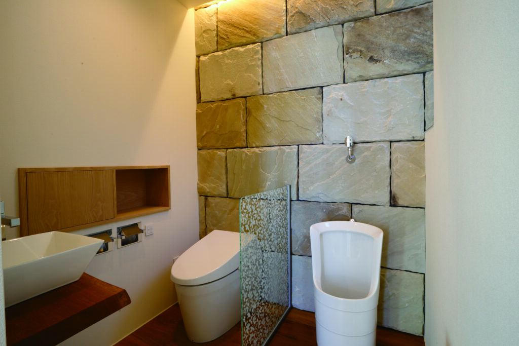 自然石をアクセントに取り入れた、素材感のある落ち着いたトイレ空間