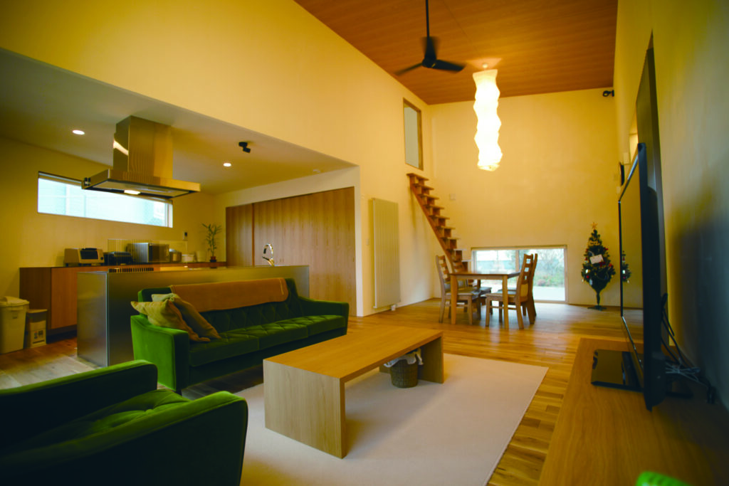リビング・ダイニング・キッチンが一体となった大空間。吹き抜けの高天井と柔らかな照明が、ゆったりとした時間を演出。小上がりスペースや階段も空間のアクセントに。