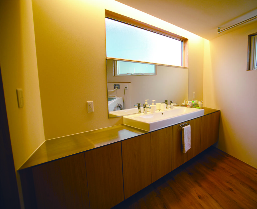 横長の窓から自然光が差し込む洗面台。ステンレスと木材の異素材を組み合わせた造作カウンターが、ホテルライクな雰囲気を醸し出す。