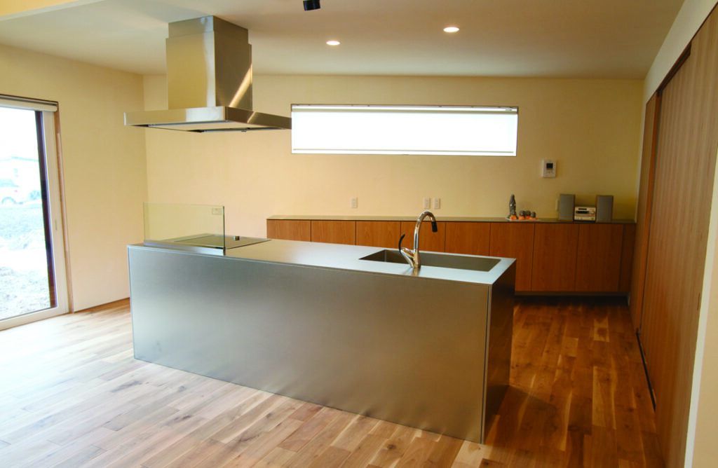 ミニマルなフォルムのオープンキッチンはステンレス仕上げ。背面の木製収納と対比させたことで、空間にリズムが生まれている。