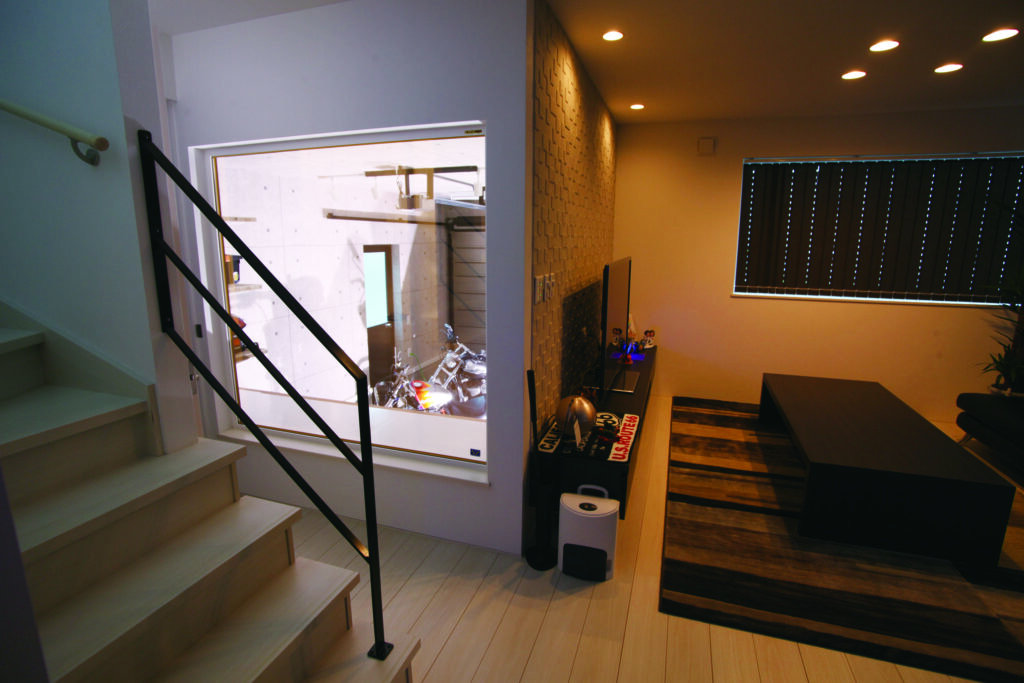 室内から愛車が見える、まさに「ガレージライフ」を体現した設計。吹き抜けとアイアン手すりが、開放感とスタイリッシュさを演出します。