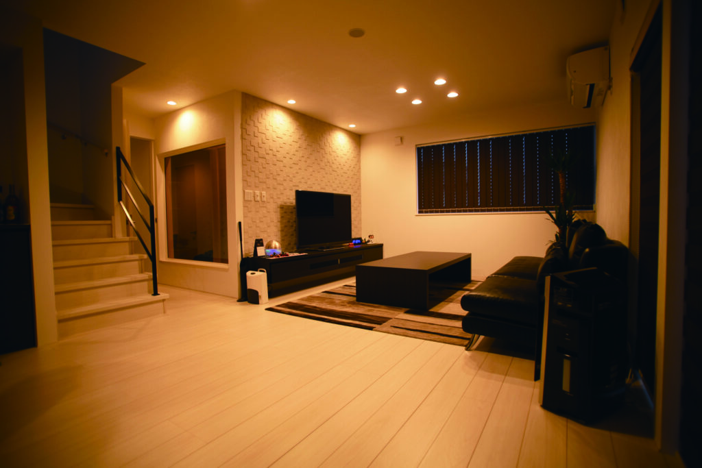 間接照明とアクセント壁が印象的なリビングは、まるでホテルラウンジのような落ち着き。低めの家具が空間に広がりをもたせています。