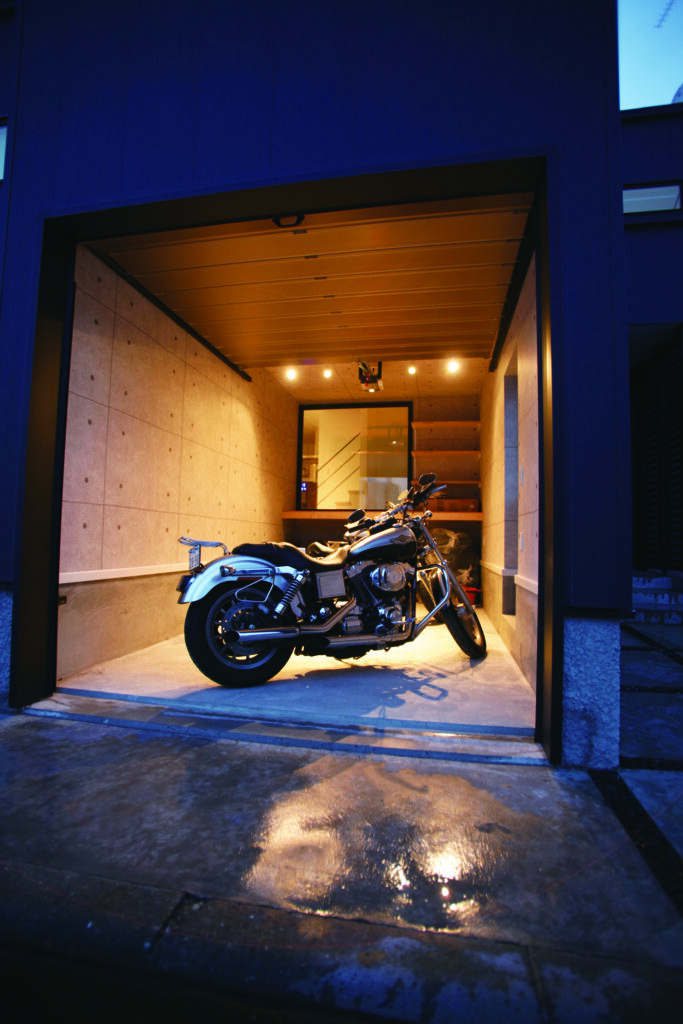 打ちっぱなしのコンクリート壁と照明に囲まれたガレージ。大切なバイクの“ショーケース”としても機能する、贅沢な空間です。