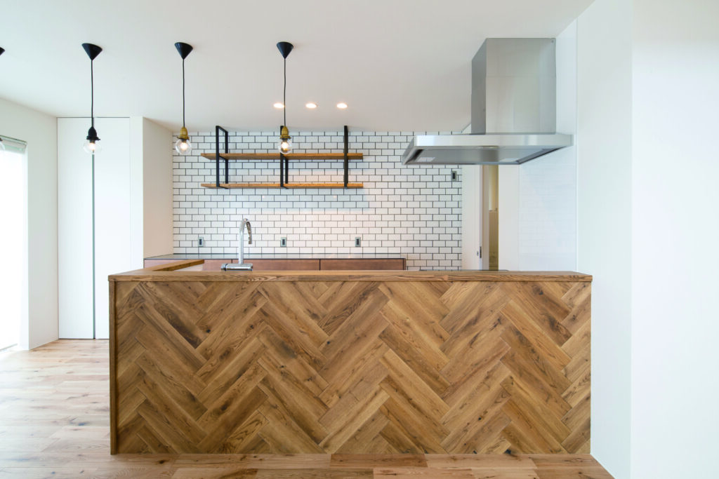 存在感のある木のヘリンボーンカウンターと、白いタイルの美しいコントラスト。アイアンの棚受けと木製の棚板が程よいヴィンテージ感を演出し、カフェのような雰囲気に。
