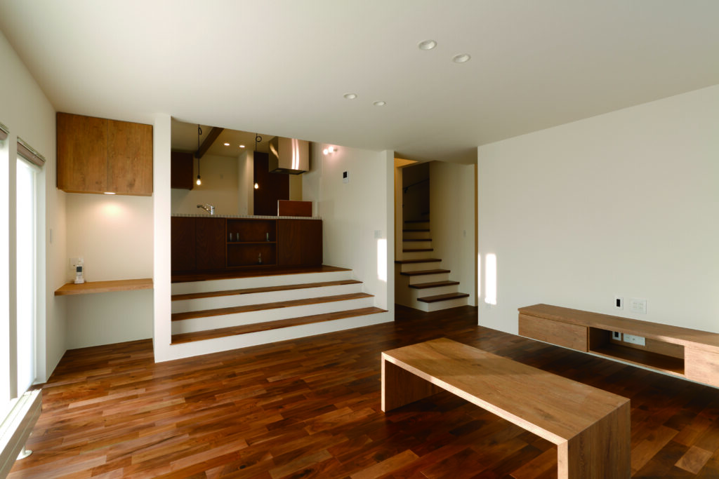木の温もりに包まれた空間に、段差でゆるやかにつながるゾーニング。