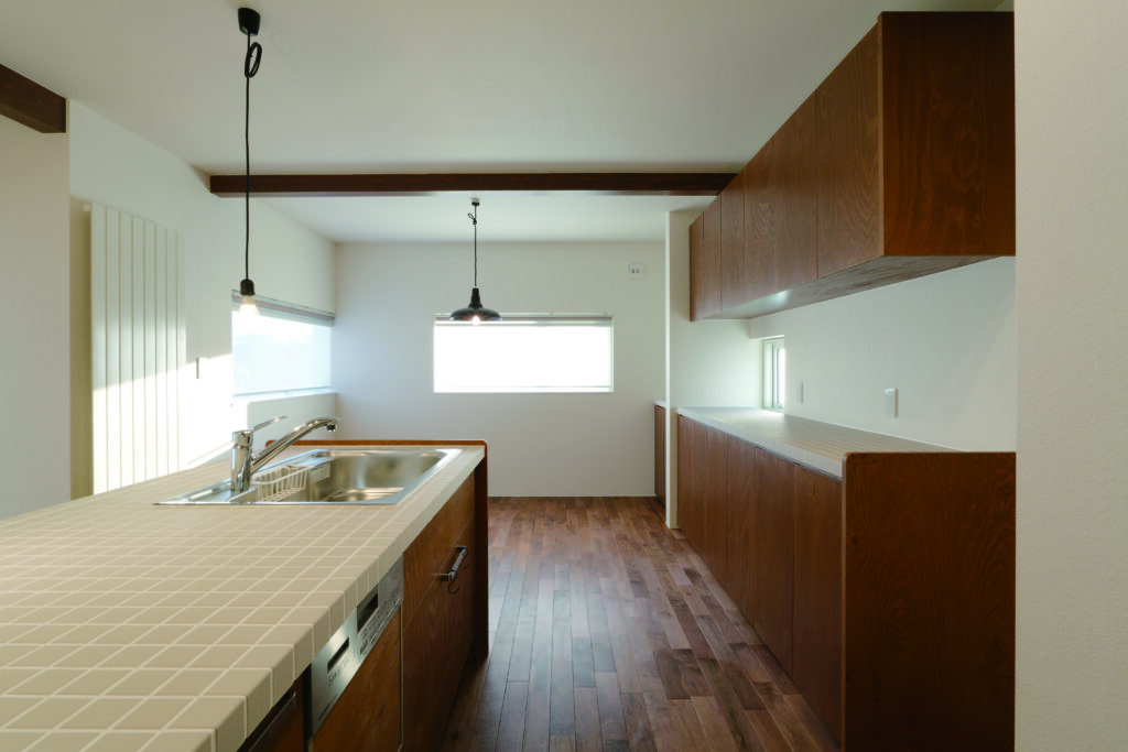 タイル貼りのワークトップと無垢材のキャビネットが、落ち着きある雰囲気を演出。