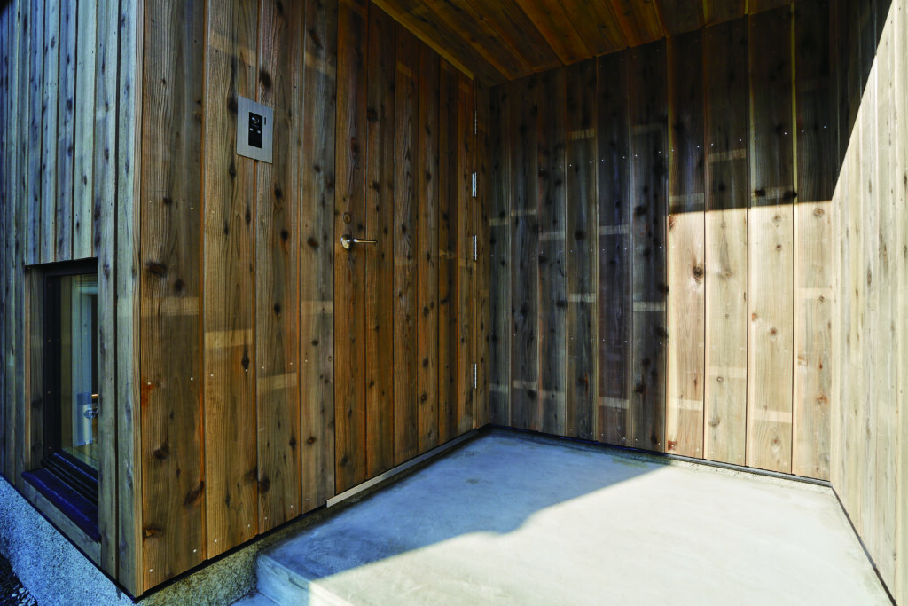 木の素材感を活かしたポーチと、ブラウンのガルバリウム鋼板が印象的な外観。自然素材と機能性のバランスが取れた、落ち着きと力強さを感じさせるデザインです。