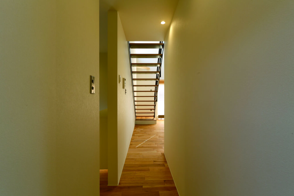 一直線に伸びる階段は、アイアンの軽やかさと木の温もりが融合。細長い廊下の先に広がる光の気配が、奥行きのある空間を演出しています。