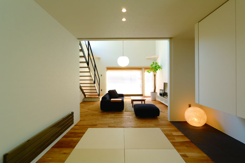 リビングと隣接する畳スペースは、柔らかな間接照明と自然光が重なり合う心地よい場所。床座とソファが共存することで、多様な過ごし方を受け入れる余白のある空間です。