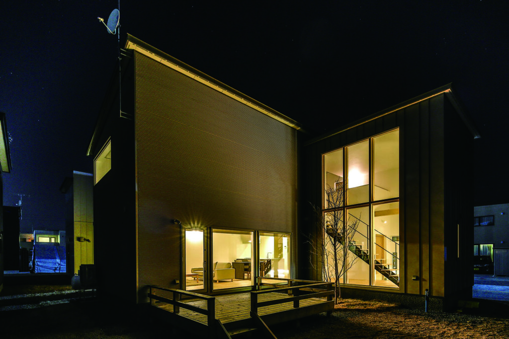 大きな吹き抜け窓からやさしい明かりがこぼれる、印象的な夜の外観。陰影を強調する照明が、直線的でモダンなフォルムを際立たせています。シンプルながらも上質な佇まいが、街並みに落ち着きを与えます。