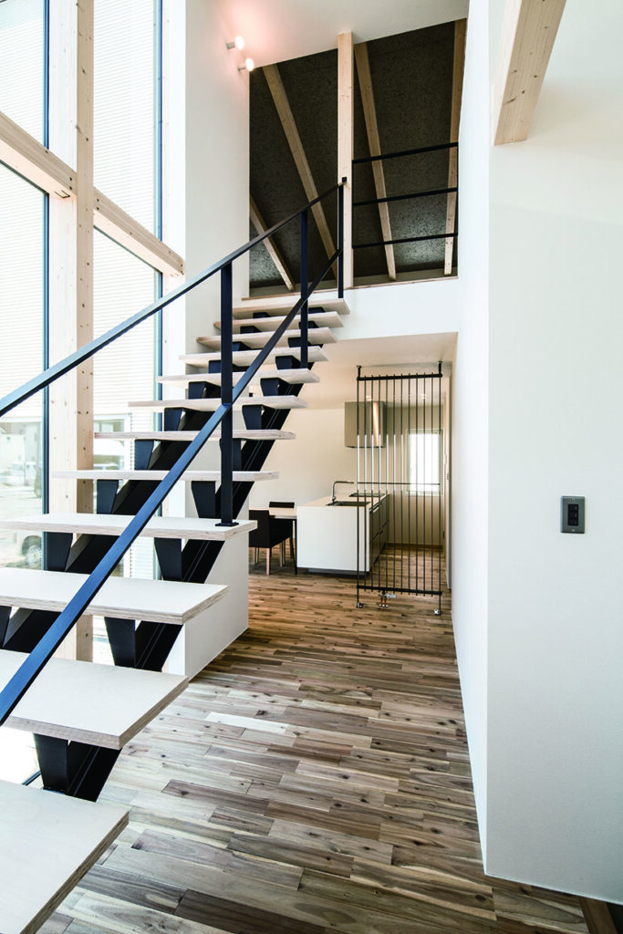 吹き抜けに面した大開口と軽やかなストリップ階段が、視線と光を縦へと導く設計。スケルトン階段と高天井が空間に伸びやかさを与え、木梁が温かみをプラスします。キッチンは奥に配置され、動線も美しく整理されています。