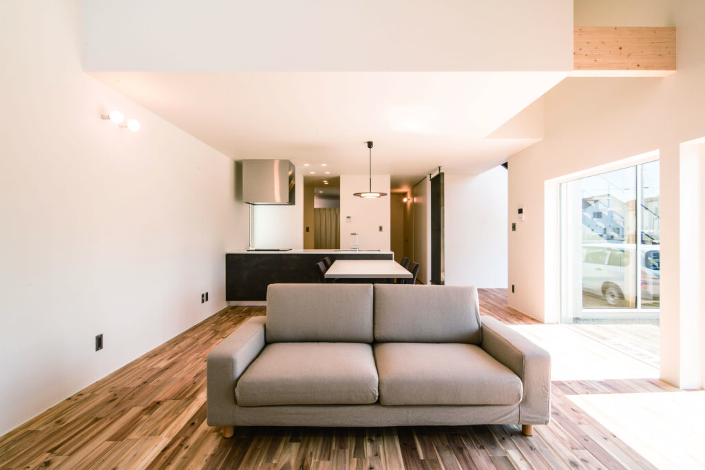 キッチンからリビングまでを一直線にまとめた構成。明るく開放的な空間に、ソファの落ち着いた色味がアクセントに。床には個性的な表情の無垢材を用い、空間にリズムとぬくもりをもたらします。