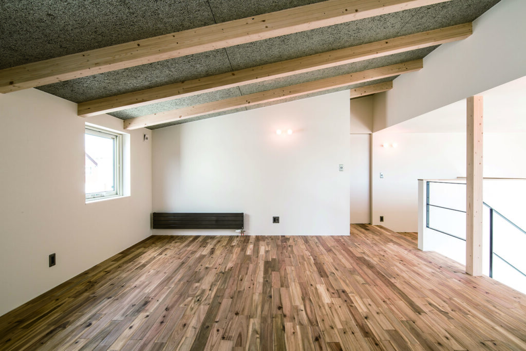 天井の木梁と木毛セメント板が印象的な2階ホール。遮音性・吸音性を高めつつ、インテリアのアクセントとしても機能。家族共有のセカンドリビングとして活用できるフレキシブルな空間です。