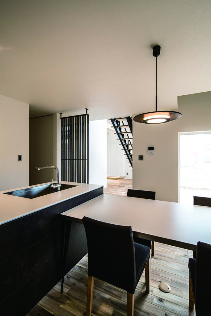 キッチンカウンターと一体化したダイニングテーブルは、家事動線と団らんの中心に。ブラックアイアンの縦格子やシンプルなペンダントライトが、空間に引き締まった印象を与えています。