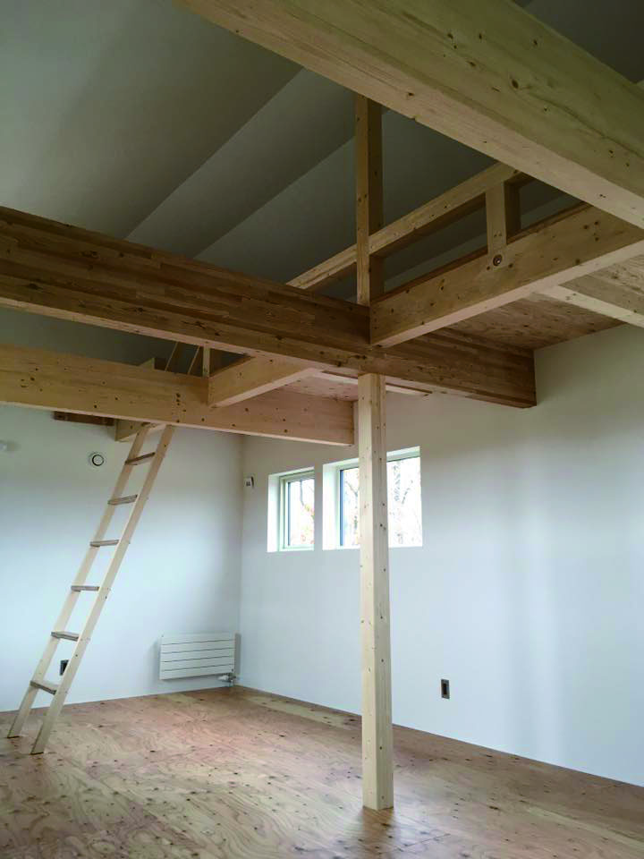 木の構造をそのまま活かしたロフトのある部屋は、子ども部屋や趣味のスペース、仕事場にもぴったり。白い壁と木の質感が心地よく、ミニマルながらも豊かな空気感があります。