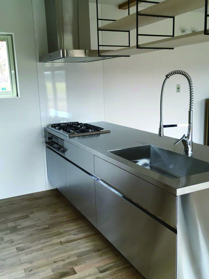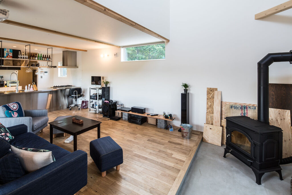 リビングには薪ストーブが設置され、天井高のある開放的な空間に温かさと豊かさを添えています。キッチンはステンレスを基調としたシャープなデザイン。吊り棚や背面のボトルラックがカフェのような雰囲気を演出します。