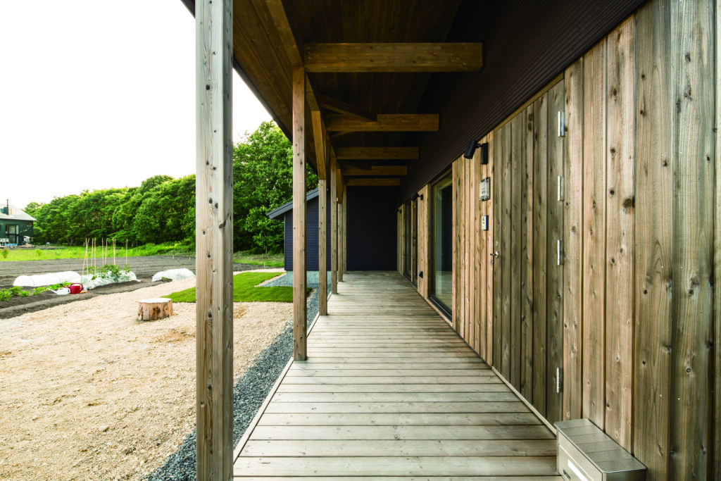 大きく張り出した軒下には、長く続くウッドデッキが。夏は日差しを遮り、冬は陽を取り込むパッシブ設計。屋内と屋外を緩やかにつなぎ、縁側のように腰かけたり、家族や友人と過ごす場所としても活用できます。