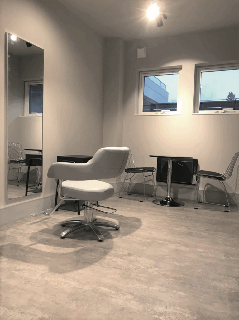 落ち着いた色合いのチェアとコンパクトなテーブルを配置。プライベート感のあるスペースで、じっくりと施術を受けられる工夫がなされています。