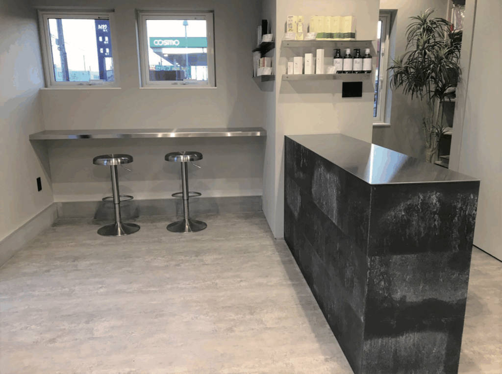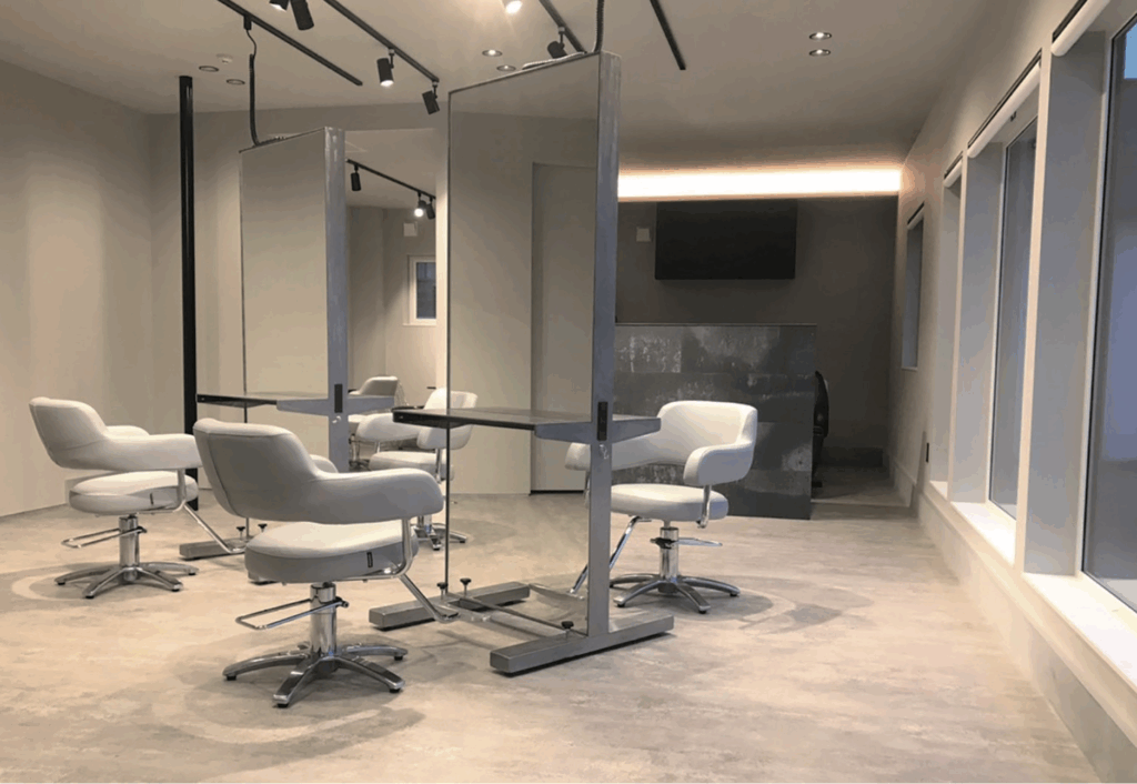 対面アイランド型のセットミラーで、コンパクトでも広がりのあるレイアウトに。トラックライト+グレアカットのダウンライトで顔映りを最適化。床はコンクリートライクなフロアでメンテ性とデザイン性を両立。