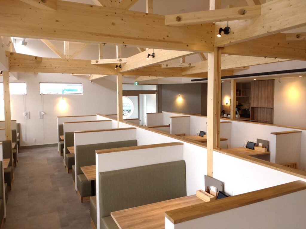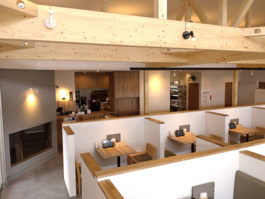 天井を高くとった開放的な空間に、無垢材の梁が印象的に巡らされた店内。